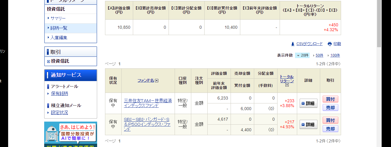 そんな、始めたばかりのオイラの投資信託の今のところの運用成績です。